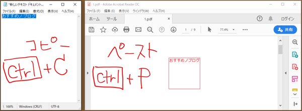 PDFにコメントを残したいときは、メモ帳アプリなどにコメントを書いて、それをコピー&ペーストでOK。